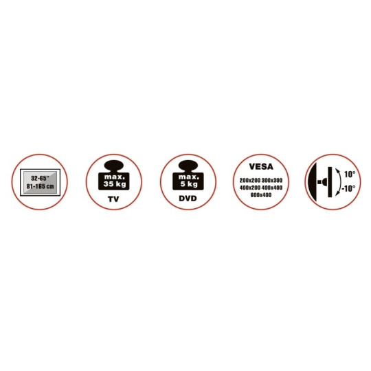 Televizní stolek na velké TV s uhlopříčkou 32"- 65" (81-165cm) a hmotností maximálně 35kg. Středový nosný profil 120-160cm na kolečkách s aretací, držák vertikálně výklopný +0°/-10°, police 33x43cm max 5kg, Cable managment, rozměry 87x63x142cm, materiál alu/ocel, barva černá. Uchycení VESA: 200x200, 300x200, 300x300, 400x200, 400x400, 600x400..