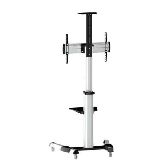 Moderní televizní stolek na Plasma a LCD TV s uhlopříčkou 37"- 70" (94-178cm) a hmotností maximálně 50kg. Středová teleskopická nosná tyč na kolečkách, držák otočný o 90° a vertikálně výklopný +5°/-12°, horní výškově nastavitelná plocha pro kameru, polička, AluDesign, barva stříbrná. Uchycení VESA: 200x200, 300x300, 400x200, 400x400, 600x400..
