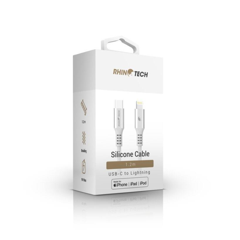 Kvalitní RhinoTech datový a nabíjecí MFi kabel z odolného nylonového materiálu s konektory USB-C na Lightning o délce 1,2m v elegantní stříbrné barvě.