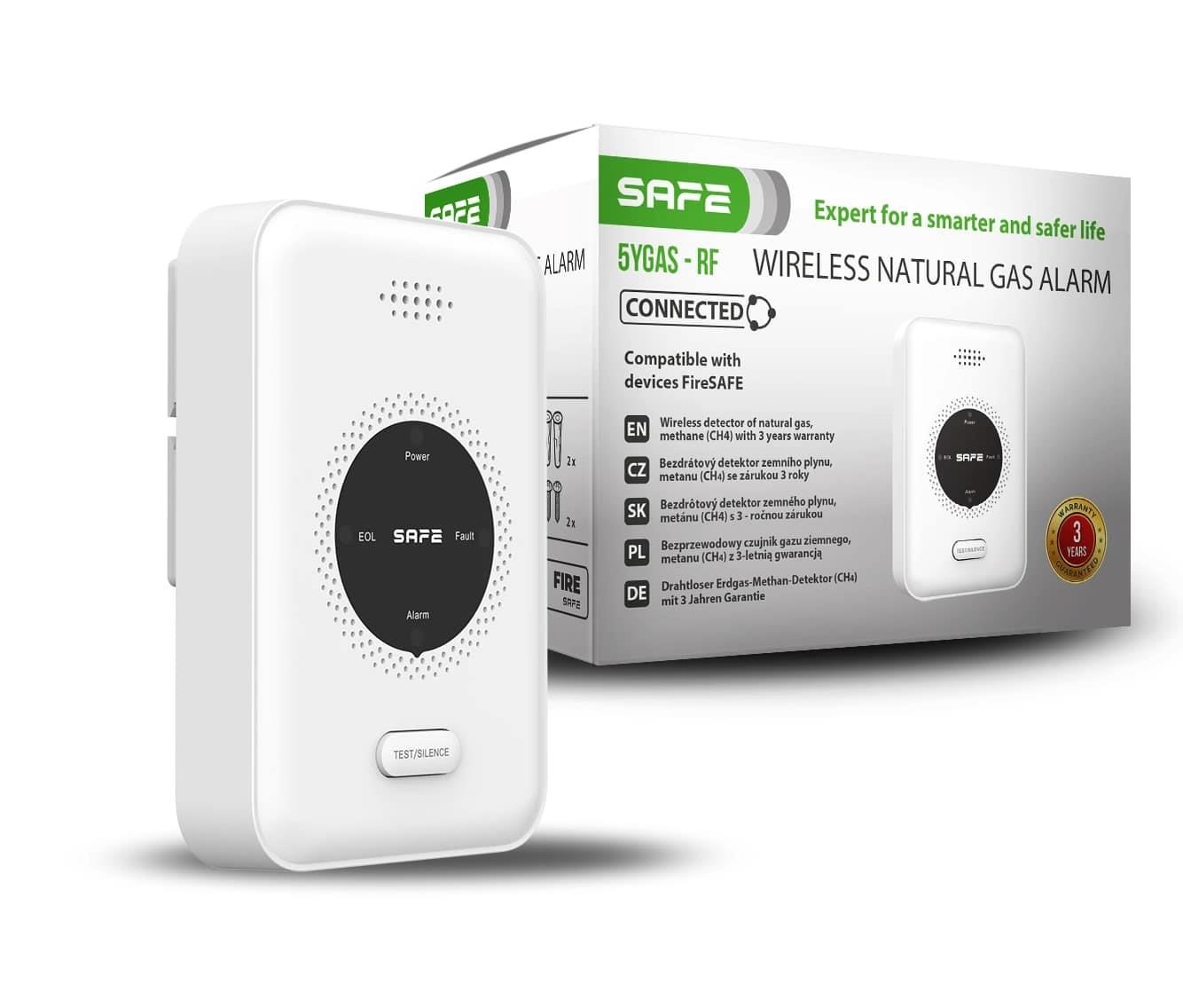 Polovodičový integrovaný senzor bezdrátového detektoru splňuje nejvyšší Evropské bezpečnostní standardy a je certifikován a kalibrován na základě normy EN 50194 (norma pro elektrická zařízení k detekci hořlavých plynů) bez další potřeby vyžadující pravidelné servisní kalibrace. Senzor druhé generace provádí nepřetržité testování ovzduší na přítomnost nebezpečné úrovně koncentrace plynů v monitorovaném prostoru. Přístroj je řízen moderním mikroprocesorem, který při zjištění nebezpečné úrovně plynu ihned vyšle rádiový signál a aktivuje jak vizuální, tak akustický poplach. Tím SAFE 5YGAS – RF poskytuje včasné varování před únikem plynu a přispívá k maximální ochraně vašeho domova.