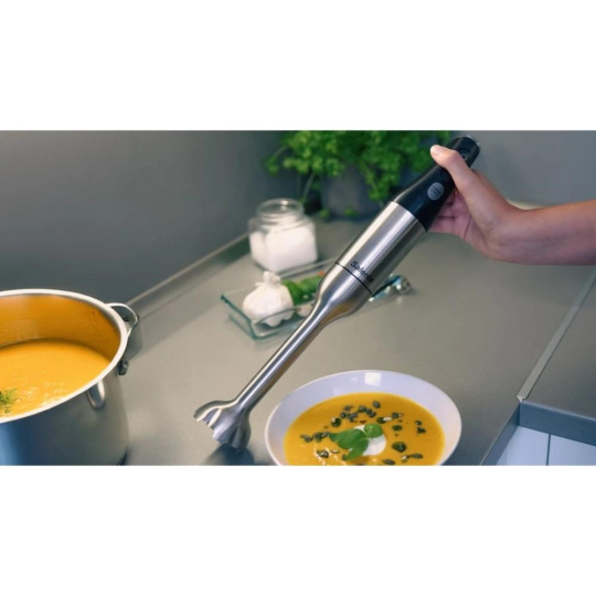- Speciální kombinace ergonomie a vroubkovaného povrchu úchopové části mixéru zajišťuje pevný úchop v každé situaci
