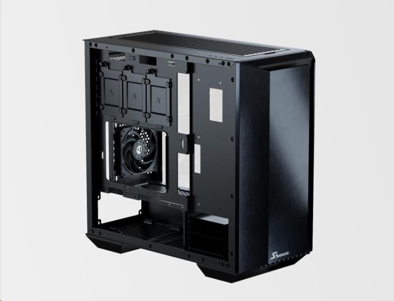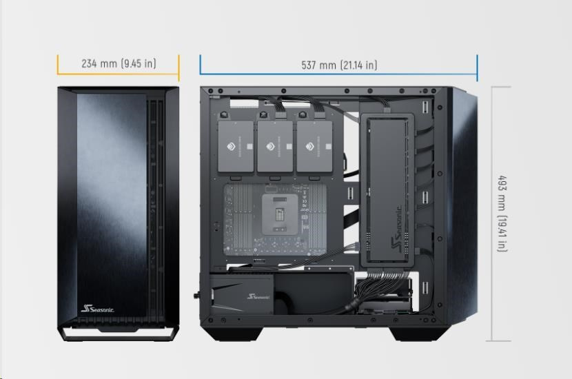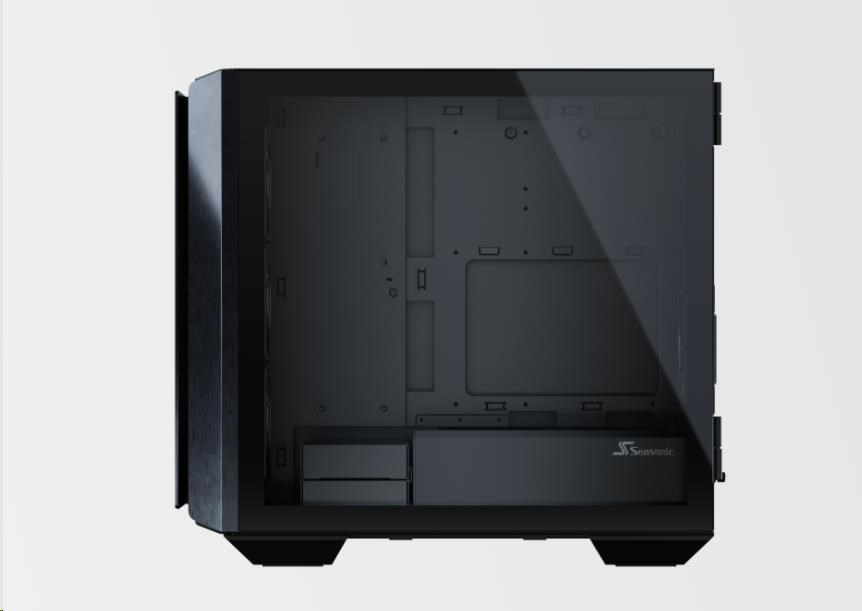 The state-of-the-art Seasonic SYNCRO Q7 Series is a mid-tower ATX chassis that features an aluminum body and a tempered glass panel on one side and the Seasonic SYNCRO CONNECT Module on the other. This setup can accommodate powerful hardware and provides versatile cooling and ventilation options. The SYNCRO CONNECT Module functions as a cable management hub, to which the components are directly connected with generally shorter cables. This setup simplifies cable routing and allows for a clean look on both sides of the case.