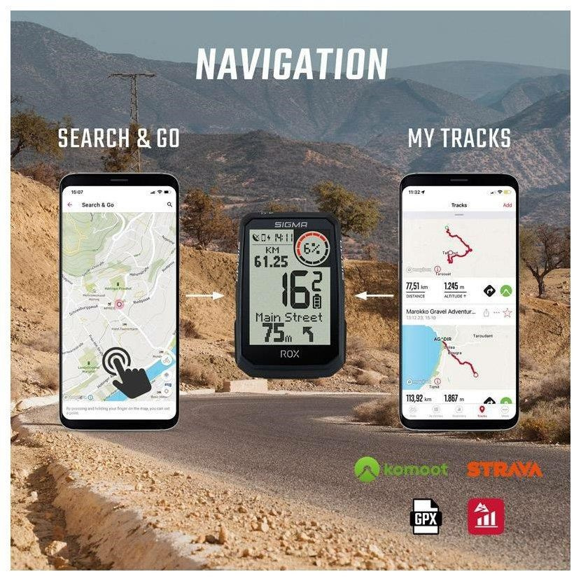 Během navigace se na displeji ROX 4.0 Endurance zobrazuje trasa a pokyny pro odbočení "Turn-by-Turn". Odbočovací šipka a akustický signál ukazují další odbočku. Abyste odbočku nepřehlédli, odpočítává červený kruh pomocí barevných pruhů vzdálenost do další odbočky. Ty se zmenšují, čím blíže jste k odbočce. ROX 4.0 Endurance také zobrazuje názvy ulic. Pokud se spontánně odchýlíte od navržené trasy, zařízení ROX v součinnosti s aplikací SIGMA RIDE rychle naplánuje novou trasu do cíle s odpovídajícím aktualizovaným výškovým profilem.