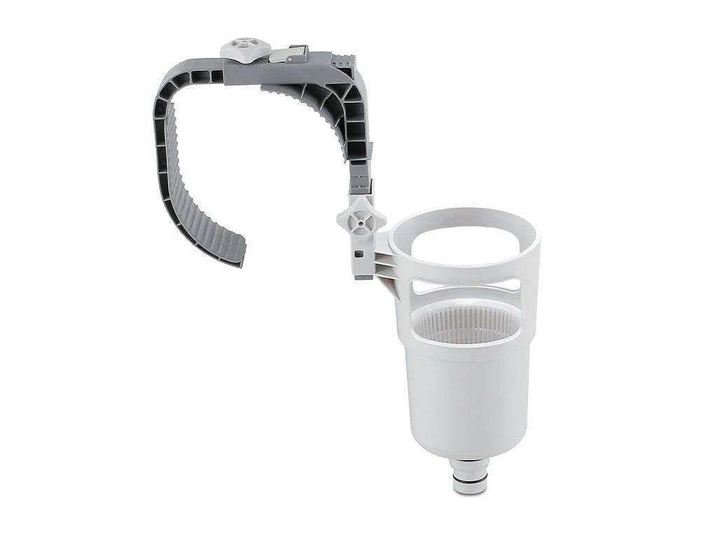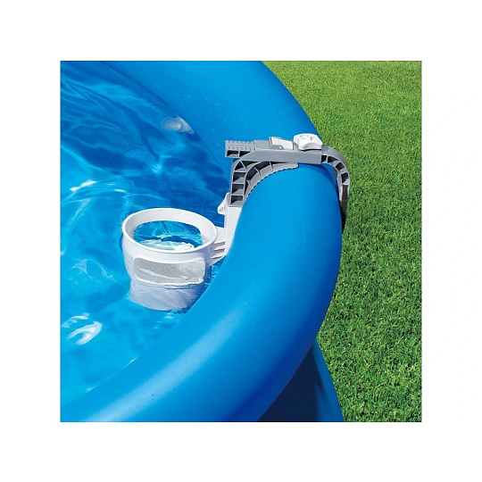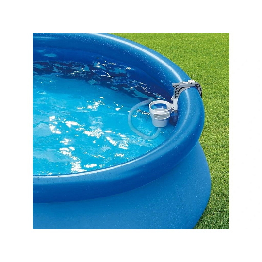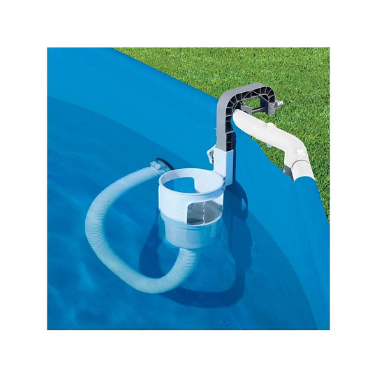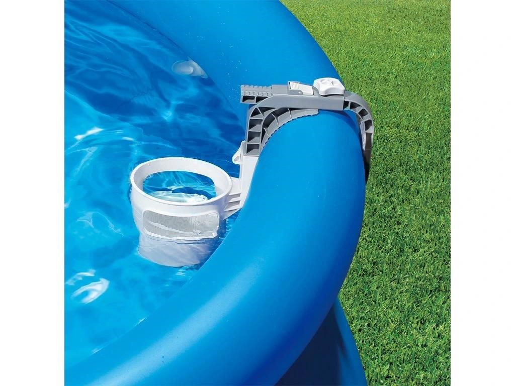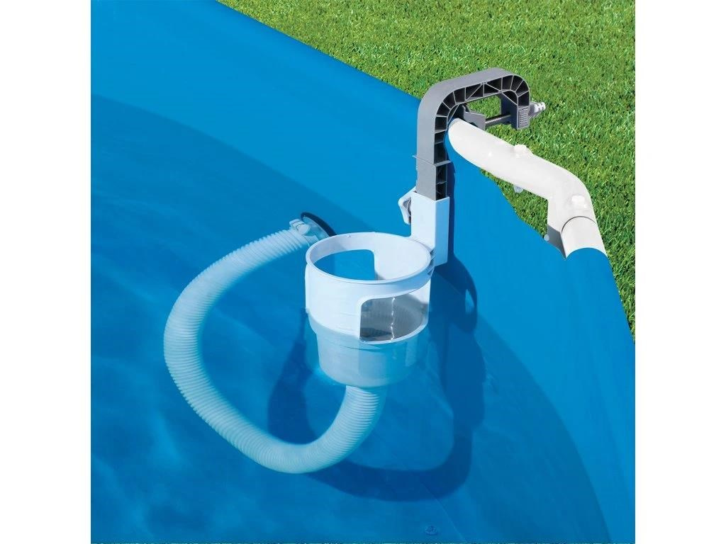 Skimmer upevníte na nafukovací límec nebo pomocí výměnného držáku na rámový bazén. Propojovací hadicí spojíte skimmer s bazénovou tryskou (sací), kdy použijete přiložené adaptéry.