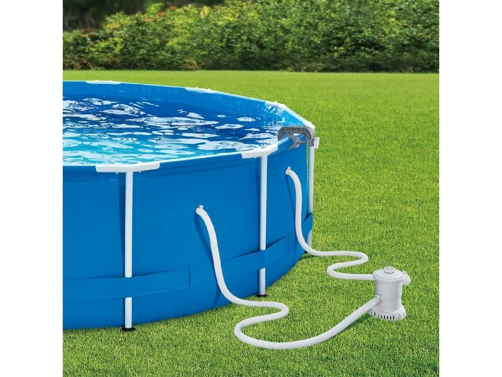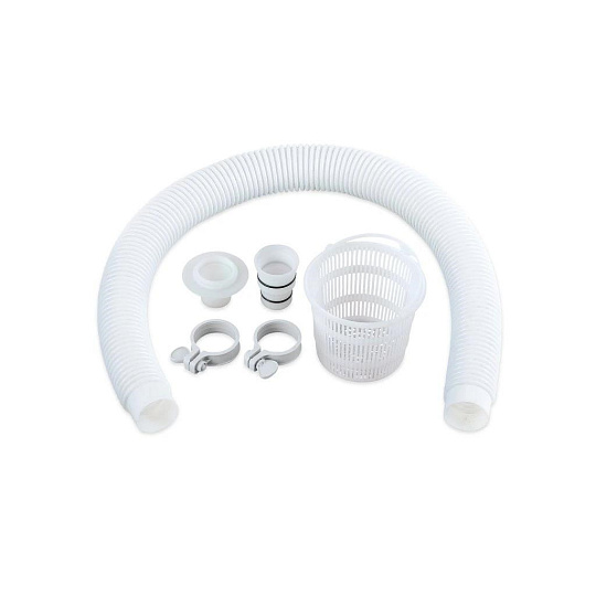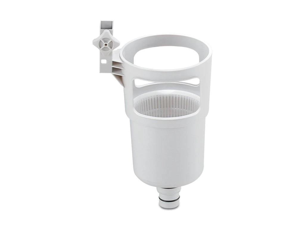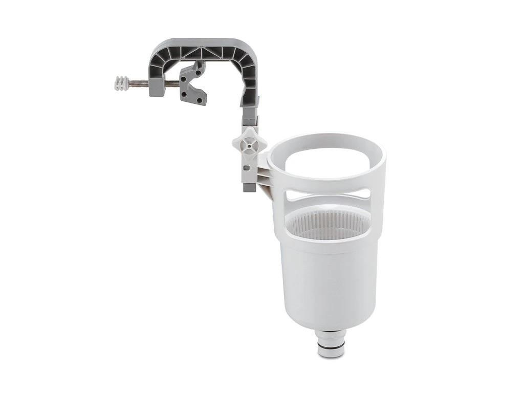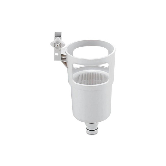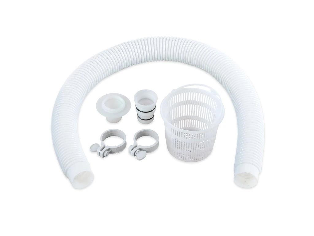 Skimmer upevníte na nafukovací límec nebo pomocí výměnného držáku na rámový bazén. Propojovací hadicí spojíte skimmer s bazénovou tryskou (sací), kdy použijete přiložené adaptéry.