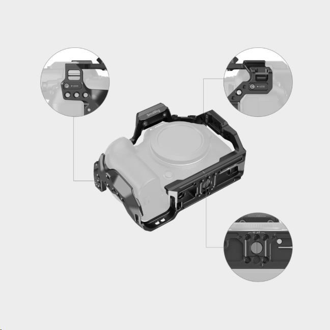 Klec je také vybavena studeným držákem pro připevnění mikrofonu, LED videosvětla apod. a otvory pro popruh SmallRig Hand Strap 3848 & 2456 a také zásuvkou QD kompatibilní se systémem Quick Disconnect pro ramenní popruh.