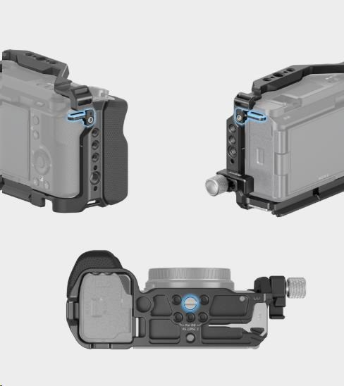 včetně závitových otvorů 1/4"-20 a polohovacích otvorů ARRI 3/8"-16 pro horní rukojeť SmallRig 3765, boční rukojeť 2913, jeden horní polohovací otvor ARRI 3/8"-16 pro držák monitoru SmallRig 2903, dva držáky studené patky pro mikrofon, LED video světlo a spodní zásuvka QD pro ramenní popruh.