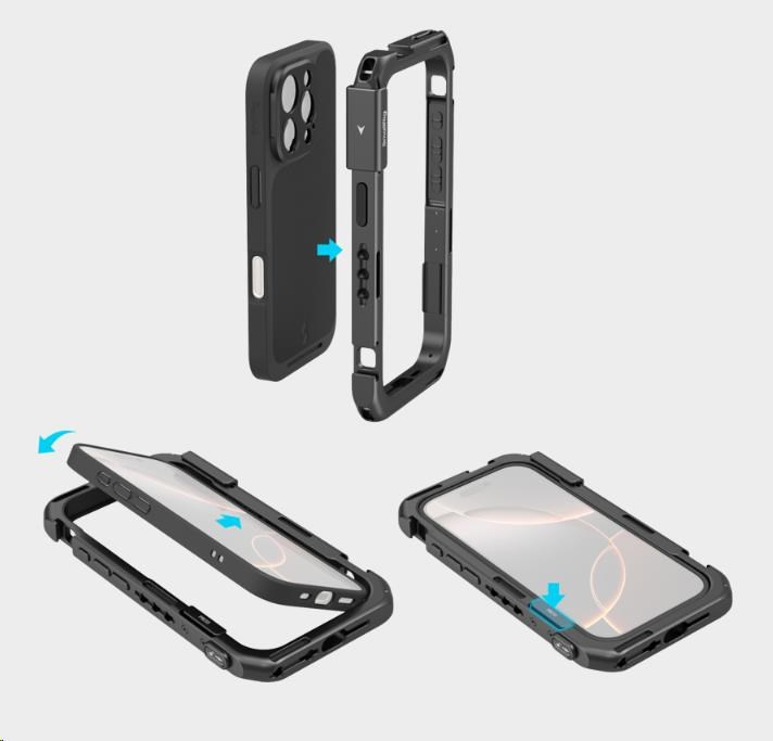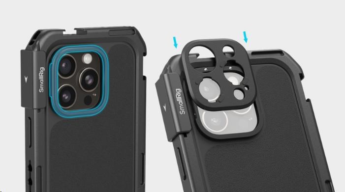 Telefon lze rychle upevnit do klece, která je vybavena několika otvory s 1/4"-20 závitem proti otočení a úchyty pro studenou patku, a rozšířit ji tak o příslušenství, jako jsou rukojeti, stativy, mikrofony a světla, což zvyšuje zážitek z fotografování, zatímco integrované rychloupínací rozhraní zajišťuje bezproblémové připojení.