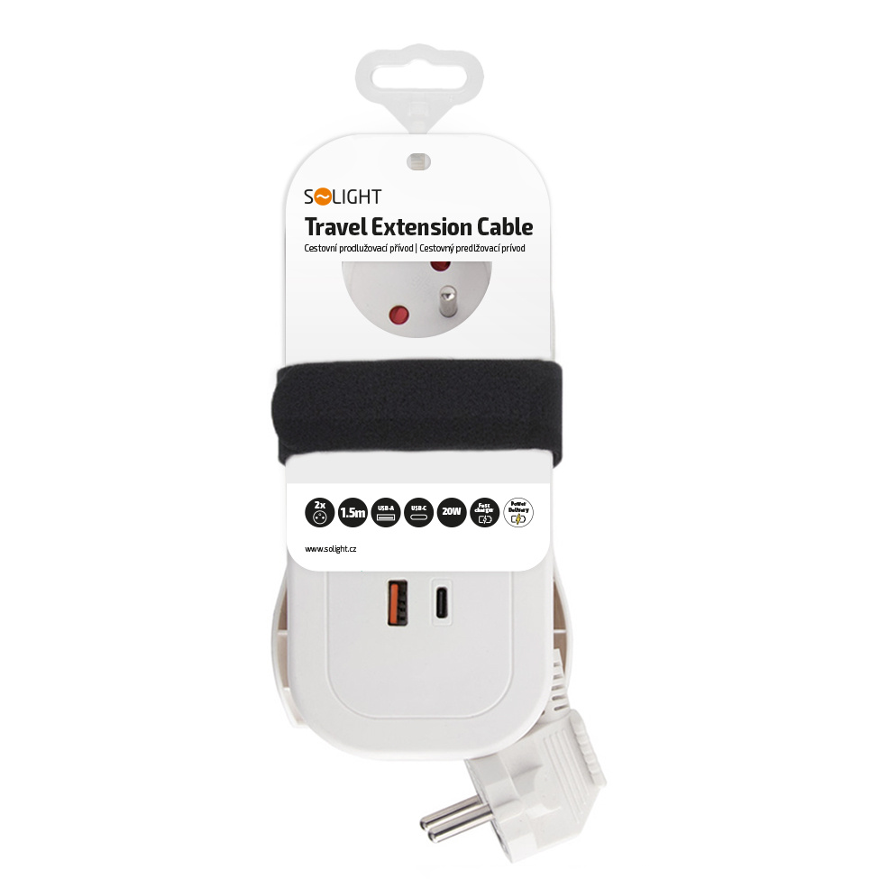 Solight 2z + USB A+C 20W PD, cestovní prodlužovací přívod 1.5m, bílý