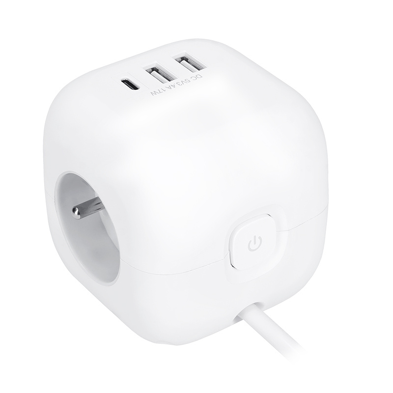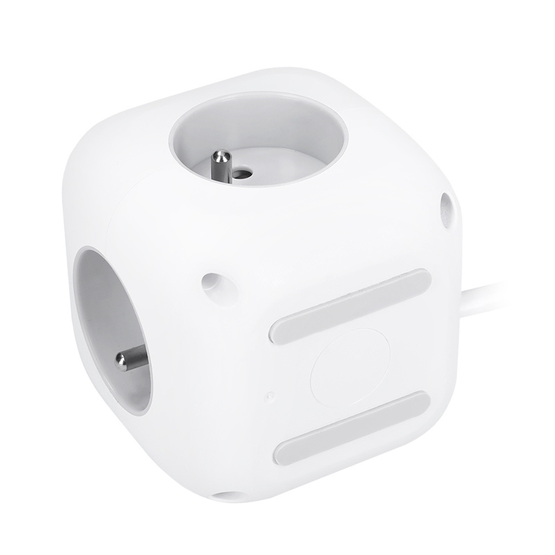 Promyšlené rozmístění zásuvek umožňuje snadné připojení různých přívodních šňůr i objemných napájecích adaptérů bez vzájemného překážení. Elegantní kostkový design se zaoblenými hranami, bílým tělem a šedými zásuvkami se hodí do každého prostředí – ať už jde o kancelář, domácnost nebo pracovní dílnu.