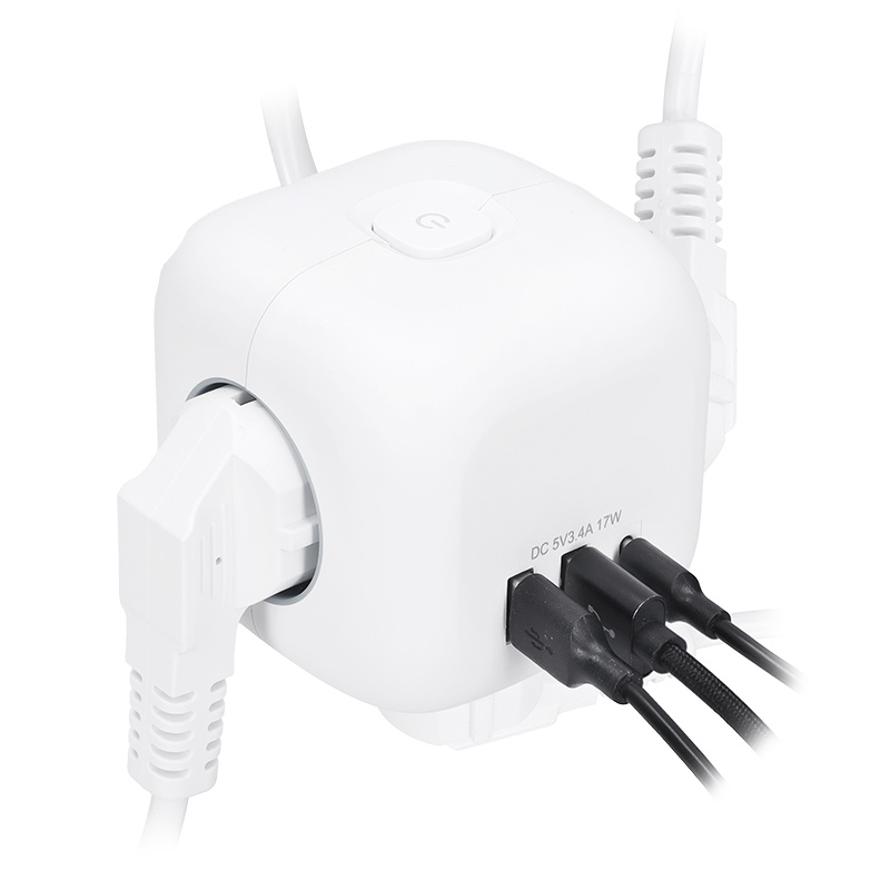 Prodlužovací přívod ve tvaru kostky s délkou strany 8 cm spojuje tři uzemněné zásuvky s dětskou pojistkou a USB nabíječku s porty USB-C a USB-A. Díky 2m dlouhému kabelu poskytuje flexibilní využití. Protiskluzové podložky udržují přívod stabilní na stole nebo pracovní ploše. Podsvětlený vypínač umožňuje snadné ovládání všech zásuvek i USB portů.