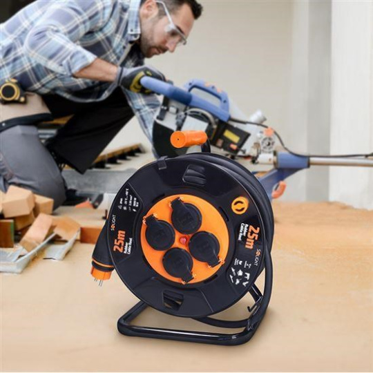 Spolehlivý pomocník všech profesionálů – 25m prodlužovací kabel s robustní konstrukcí navijáku a cívkou z odolného plastu. Vodící oko zajišťuje plynulé navinutí kabelu a ušetří tak čas i nervy. Prodloužená zástrčka kabelu s gumovou protiskluzovou rukojetí ulehčuje manipulaci i v rukavicích. Buben umožňuje zapojit až čtyři elektrická zařízení a díky průměru vodiče 2,5 mm2 zvládne zatížení až 3 680 W (16 A / 230 V~) po dlouhou dobu. Kabel v délce 25 m umožní flexibilní práci v mnoha profesích. Samovolnému navíjení brání brzda pro aretaci. Naviják má stabilní konstrukci, zesílené tělo cívky zajišťuje dlouhou životnost, snadnou manipulaci a spolehlivost při používání.