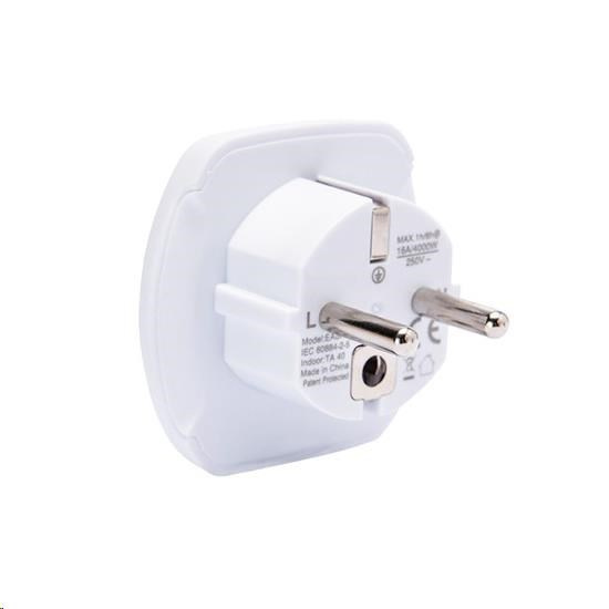 univerzální adaptér s uzemněním, max. 16A pro cizince navštěvující ČR, SR nebo pro připojení zahraničního výrobku s jinou vidlicí přívodní šňůry v českých zásuvkách všechny spotřebiče s 2- a 3-kolíkovou šňůrou patentovaná konstrukce rozšířená zadní část pro bezpečné vytažení adaptéru ze zásuvky dětské pojistky barva: bílá.