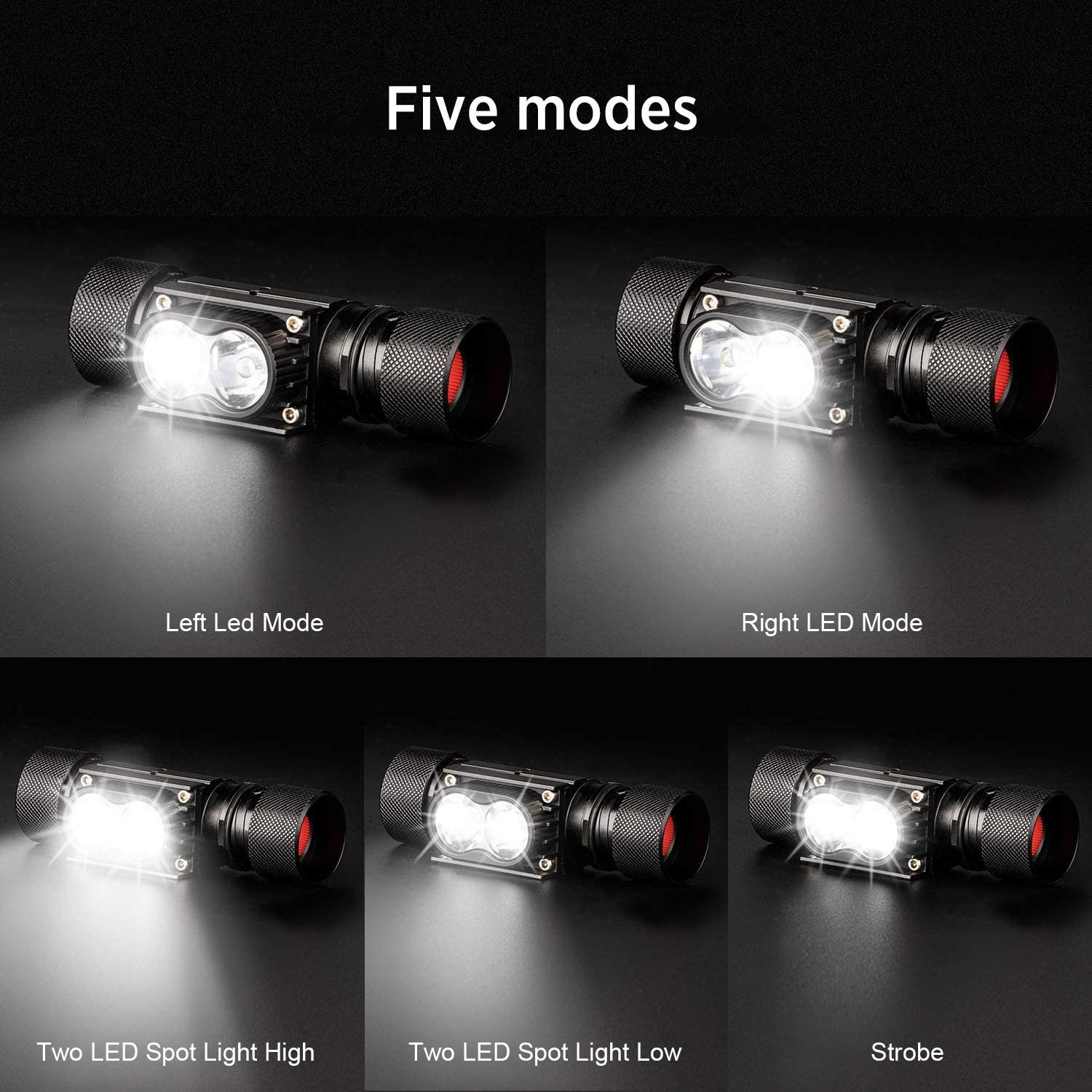 - 5 režimů svícení: pravá LED 100%, levá LED 100%, obě LED 100%, obě LED 50%, blikání