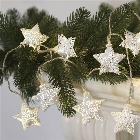 LED řetěz vánoční hvězdy bílé, počet LED diod: 10, barva světla: teplá bílá (žlutá), napájení: 2x AA baterie (nejsou součástí), výdrž baterií: cca 100hod. (v závislosti na kvalitě baterií), třída ochrany: IP20 (vnitřní použití).