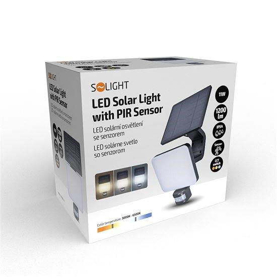 Solight LED solární osvětlení se senzorem, 11W, 1200lm, 3 CCT, Li-Ion, černá