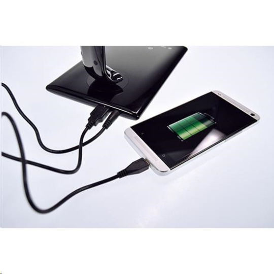 stolní lampička s LED světelným zdrojem možnost volby 5 barev světla – teplá, neutrální bílá, bílá a studená bílá (3000K-6000K) stmívatelná - plynulá regulace jasu dotykové spínání maximálně flexibilní - ohebné rameno, otočná základna a náklopná hlava příkon: max. 12W světelný tok: max. 700lm USB napájecí zdířka pro nabíjení telefonů (5V, 1000mA) USB kábel súčasťou protiskluzová základna s dotykovým vypínačem barva: bílý lesk napájení: AC 100-240V délka napájecího kabelu: 140cm rozměry: cca 420 x 360 x 125mm energetická třída: A+ LED zdroj nelze měnit materiál: ABS.
