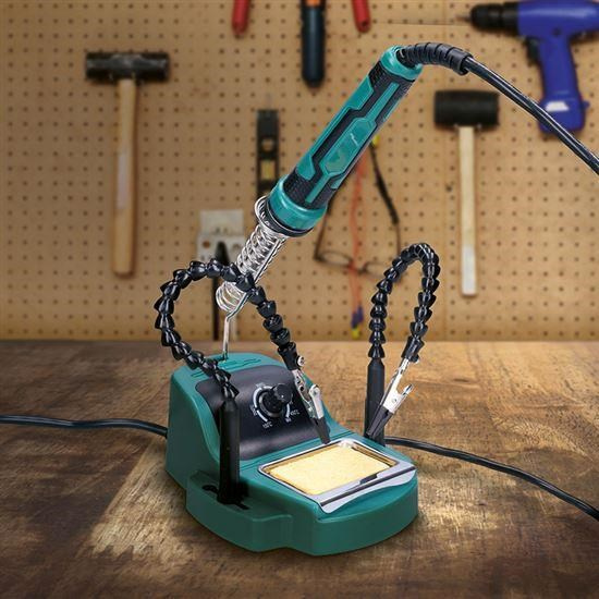Kompaktní páječka s 360° otočnými krokosvorkami, ideální pro práci s různými velikostmi součástek a desek. Silikonový kabel je měkčí a tepelně odolný pro pohodlné používání. Výkon 48 W s teplotním rozsahem 160–480 °C a keramickým topným tělesem pro rychlé a stabilní zahřívání. Příslušenství zahrnuje stojánek na pájecí pero a držák houbičky pro čištění hrotu. Napájení 230V, 50Hz.