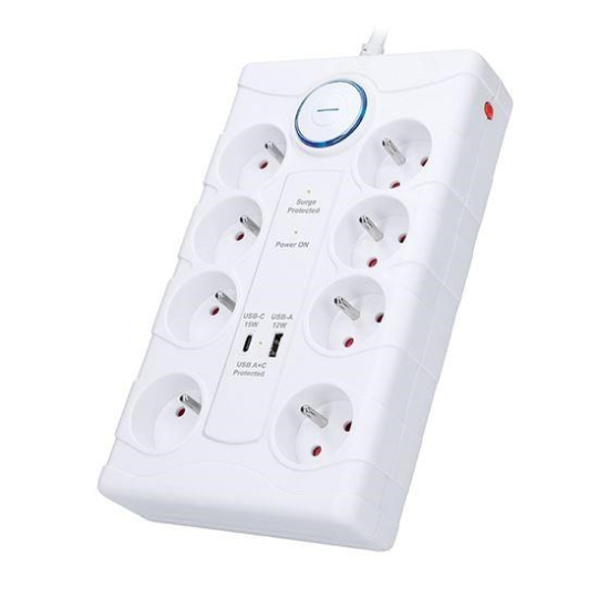 Spolehlivá přepěťová ochrana s integrovanou USB nabíječkou chrání vaše zařízení proti náhlým výkyvům napětí. Díky osmi zásuvkám a dvěma USB portům je ideální do domácnosti i kanceláře. S maximální zátěží až 3680 W zvládne i energeticky náročnější spotřebiče.