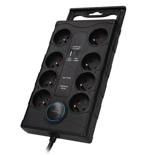Spolehlivá přepěťová ochrana s integrovanou USB nabíječkou chrání vaše zařízení proti náhlým výkyvům napětí. Díky osmi zásuvkám a dvěma USB portům je ideální do domácnosti i kanceláře. S maximální zátěží až 3680 W zvládne i energeticky náročnější spotřebiče.