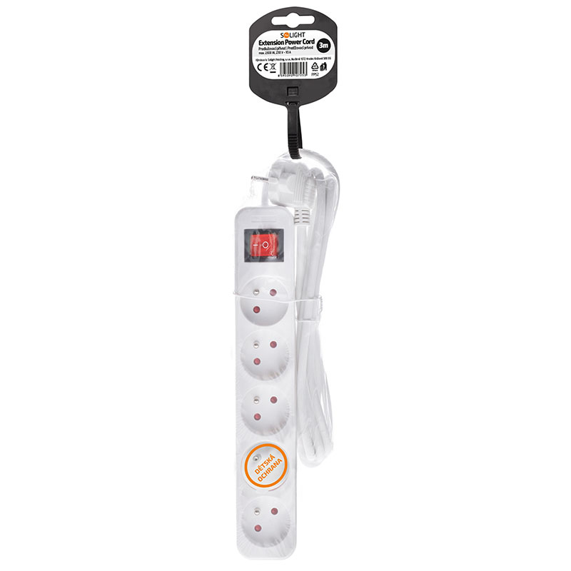 Solight prodlužovací přívod, 5 zásuvek, bílý, vypínač, 3m