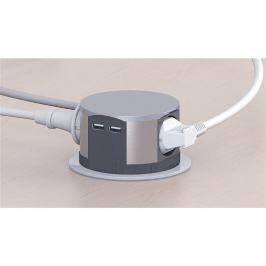 Solight výsuvný blok zásuvek, 3 zásuvky, 2x USB, kruhový tvar nízký, prodlužovací přívod 1,5m, 3 x 1mm2, stříbrný