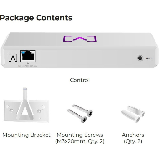 Lokální hardware Alta Labs Controller soužící pro monitoring a správu až 1000 jednotek Alta Labs - Wi-Fi Access Pointů, Switchů a Routerů ve vaší síti. Velice decentní a jednoduché zařízení s 4-jádrovým Qualcomm CPU s taktem 2200 MHz, jedním Gigabit LAN portem, podporou napájením přes PoE (802.3af, 42 - 57 V DC), USB-C konektorem (5 V / 3 A), Bluetooth pro prvotní nastavení přes mobilní aplikaci a předinstalovaným Alta Labs Controllerem dostupným přes webové rozhraní. Obsah balení • Zařízení • Držák na zeď • Šroubky + hmoždinky Konektory a rozhraní Rychlost LAN (1) 10/100/1000Mbps Ostatní Bluetooth Napájení Napájení přes PoE 802.3af, 42 .. 57V DC Typ napájení PoE, USB-C Max. spotřeba energie [W] 8 Napájení přes konektor/svorkovnici 5V / 3A Fyzické charakteristiky Provedení Na zeď, Desktop Ventilátory Bez ventilátoru Tlačítka Reset Provozní teplota [°C] -5 až 50 Hmotnost [g] 380 Hloubka [mm] 91 Šířka [mm] 180 Výška [mm] 26 Hardware CPU Qualcomm Frekvence CPU [MHz] 2200 Počet CPU jader 4 Software Předinstalovaný kontroller Alta Labs Controller Management Webové rozhraní Výchozí IP adresa Dynamická z DHCP Výchozí jméno a heslo Nastavuje se při prvním spuštění.