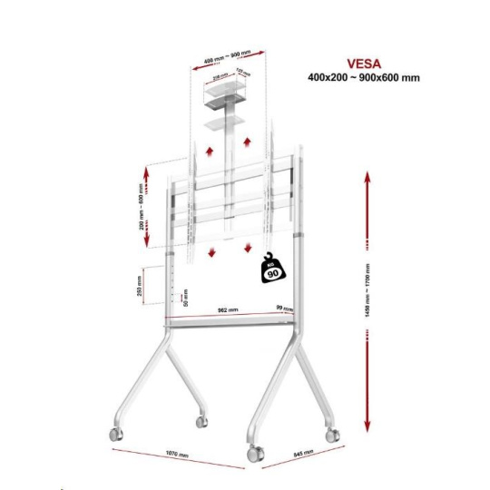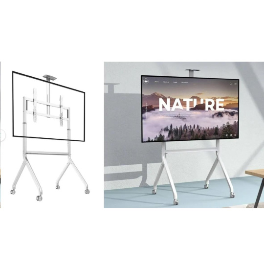 Mobilní stojan pro multimediální tabule, interaktivní monitory a LCD LED TV 60" - 100" Model: NB P200W Stojan na interaktivní tabuli / televizi / monitor NB P200W  Charakteristika:  Univerzální mobilní televizní vozík / stojan pro velké obrazovky Perfektní řešení pro interaktivní tabule a multimediální obrazovky Široká, stabilní základna se snadným přístupem k dotykovým obrazovkám Nastavení výšky obrazovky Vysoce kvalitní materiály mají za následek velmi pevnou a odolnou konstrukci Výškově nastavitelná police na fotoaparát, kameru nebo jinou AV techniku Přídavná police pod zástěnou na příslušenství Plná shoda se standardem VESA Jednoduchá a rychlá montáž Ideální pro konferenční místnosti, školy, výstavy i pro soukromé použití Čtyři otočná gumová kolečka s funkcí aretace Vysoká nosnost, skvělá stabilita    Stojan na multimediální tabule a multimediální dotykové monitory a televize NB P200W     TECHNICKÉ PARAMETRY Maximální nosnost 90,9 kg Pro obrazovky 60" - 100" Výškové nastavení v rozsahu 145 ~ 170 cm (každých 5 cm) Gumová otočná kolečka o průměru 75 mm s funkcí aretace Pevná ocelová konstrukce Nastavitelná police na fotoaparát nebo jinou AV techniku, rozměry: Rozměr 256 x 125 mm Spodní police na příslušenství, rozměry: 962 x 99 mm Povrchová úprava: práškový lak Barva: bílá    Standard kompatibilní s VESA (rozteč montážních otvorů): VESA 200x200 (rozteč otvorů 200 x 200 mm) VESA 300x200 (rozteč otvorů 300 x 200 mm) VESA 300x300 (rozteč otvorů 300 x 300 mm) VESA 400x200 (rozteč otvorů 400 x 200 mm) VESA 400x400 (rozteč otvorů 400 x 400 mm) VESA 600x400 (rozteč otvorů 600 x 400 mm) VESA 800x400 (rozteč otvorů 800 x 400 mm) VESA 800x500 (rozteč otvorů 800 x 500 mm) VESA 800x600 (rozteč otvorů 800 x 600 mm) VESA 900x600 (rozteč otvorů 900 x 600 mm) VESA 200x200 ~ 900x600 mm (všechny kombinace otvorů v tomto rozsahu).