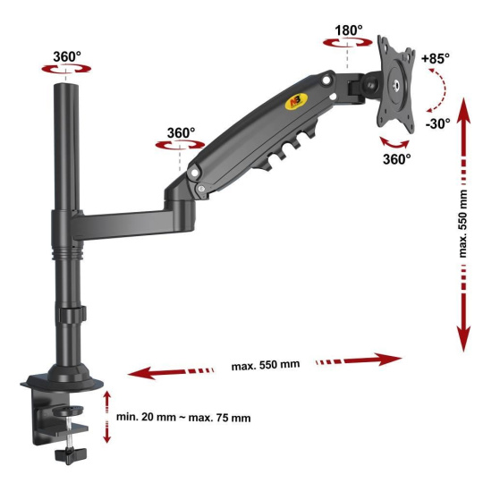 Stolní kancelářský držák na monitor NB H80B Stolní držák na monitory 17-27", plně polohovatelný, TOP kvalita a design, otáčení do stran, naklápění, vysouvání, PIVOT, VESA 75/100, nosnost 9kg Špičkový stolní držák s uchycením na okraj nebo do prostoru stolu. VESA standard 75x75 a 100x100 pro uchycení monitorů s úhlopříčkou 17-27". Držák umožňuje plnou nastavitelnost polohy monitoru: otáčení do stran, duální výškové polohování, naklápění, vzdálenost od uchycení a rotace monitoru. Rameno držáku je osazeno plynovým pístem s nastavitelnou tuhostí 2-9kg, výškové polohování je tedy extrémně jednoduché a pohodlné. Barevné provedení černé, záruka 3 roky. Stolní držák monitoru na okraj stolu nebo do prostoru stolové desky, nosnost 9kg, VESA 75x75 a 100x100, úplné 3D nastavení polohy monitoru, profesionální kvalita - NB H80B Technické údaje: zatížení: minimálně 2kg, maximálně 9kg na monitory s úhlopříčkou 17" až 27" VESA standardy 75x75 a 100x100 duální výškové polohování (ramenem s pístem + objímkou na nosníku) nastavení výšky od stolu 0-550mm otáčení do stran +360° / -360° náklon +85° / -30° rotace obrazovky - na šířku nebo na výšku dva typy úchytů na stolovou desku (na okraj stolu nebo do prostoru stolové desky) uchycení na stolové desky o průměru 20-75mm systém pro uspořádání kabelů barevné provedení černé záruka 3 roky Profesionální stolový držák na monitor NB H80B Držák monitoru NB H80B podporuje VESA standardy: VESA 75x75 VESA 100x100 Profesionální kvalita, krásný dizajn a extrémní polohovatelnost - to vše za cenu stolních držáků střední třídy..