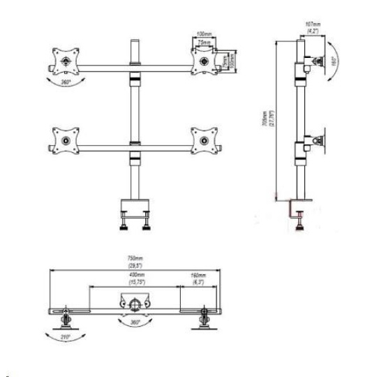 Technické údaje: maximální celkové zatížení 40kg na monitory s úhlopříčkou až 30" podporuje VESA standard 75x75 a 100x100 posun monitoru po ose držáku nastavitelná výška obou sad monitorů náklon monitoru až 160st. otáčení do stran až 70st. funce pivot - horizontální i vertikální natočení obrazovky dodáváme včetně 2 typů uchycení na stolovou desku uchycení na stolovou desku o síle 10-70mm barva stříbrná nebo černá záruka 5 let Profesionální stolní držáky na 4 monitory EDBAK podporují VESA standardy: VESA 75x75 VESA 100x100 možnost dokoupení VESA 200x100 možnost dokoupení VESA 200x200.