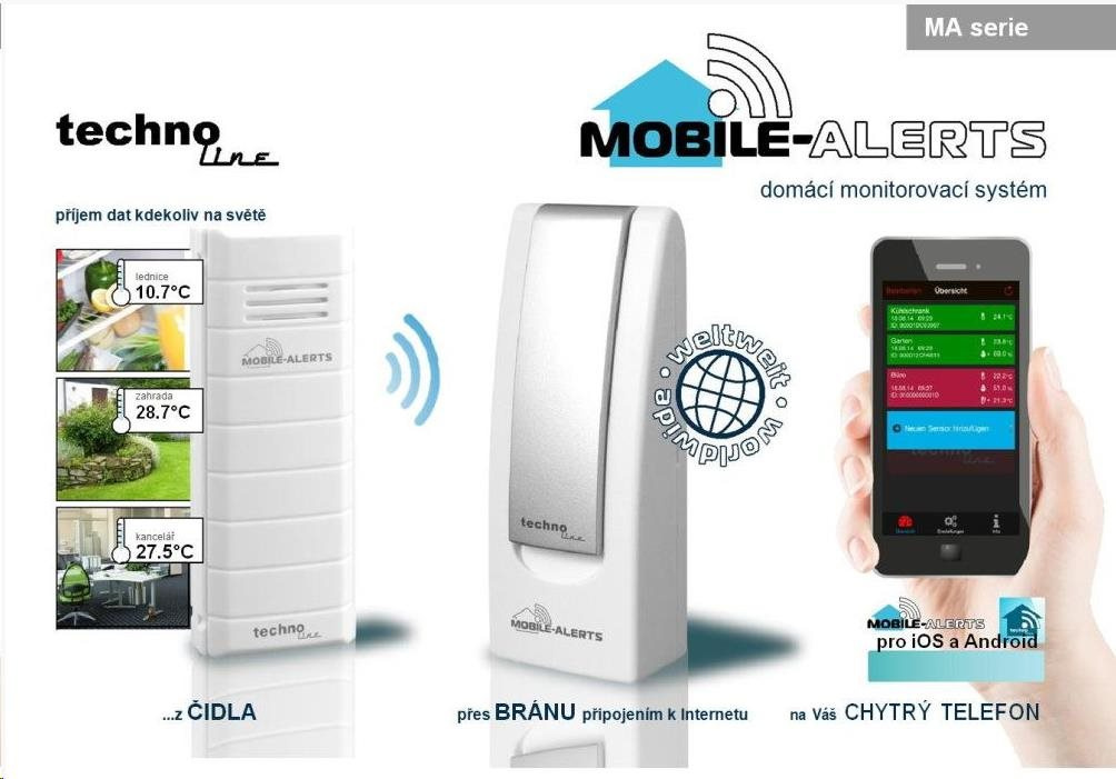Tento domácí monitorovací systém Technoline MOBILE-ALERTS využívá k zobrazování veškerých dat vaše mobilní zařízení pomocí Internetu (smartphone, tablet). Stáhněte si aplikaci MOBILE- ALERTS z příslušného zdroje v závislosti na operačním systému, které vaše zařízení používá (Android 3.2 a novější - z Google Play, iOS 7 a novější - z Apple App Store). Tato startovací sada obsahuje bezdrátové čidlo pro měření teploty a bránu, která se připojí pomocí LAN kabelu s routerem pro přenos dat na Internet.