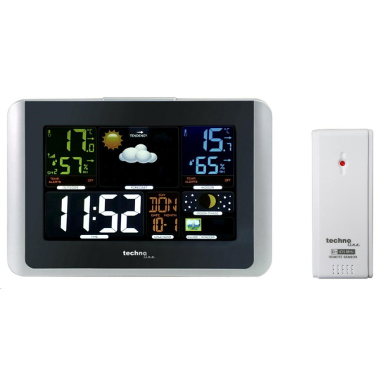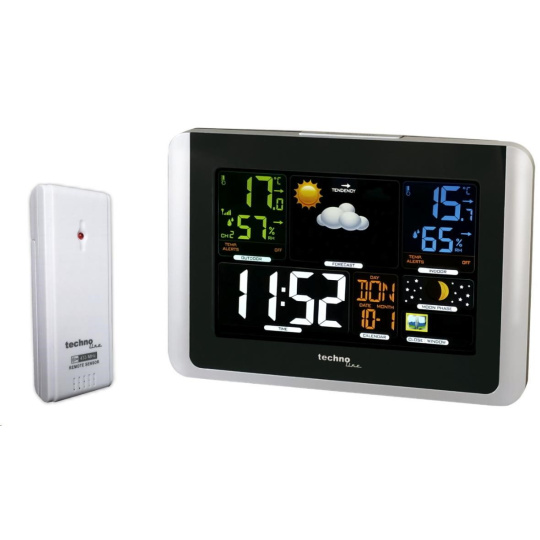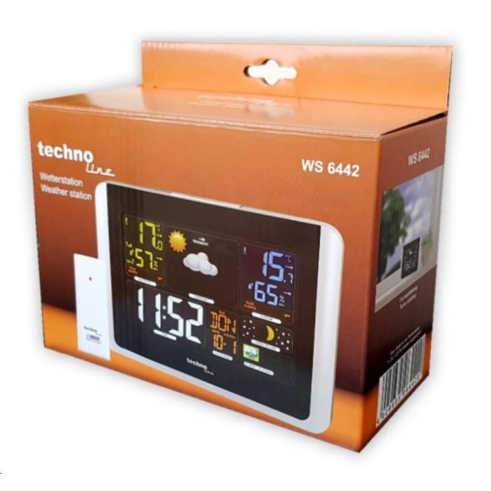 Meteorologická stanice s inverzním barevným LED displejem - barevný inverzní LED displej 127 x 79 mm, stále osvětlený při napájení síťovým adaptérem, 2 stupně jasu, možnost vypnutí, při napájení bateriemi možnost osvětlení displeje na 10 s - barvy displeje: čas bílá, datum oranžová, vnitřní teplota a relativní vlhkost modrá, venkovní teplota a relativní vlhkost zelená - velikost číslic: čas 25,5 mm, zkr. názvu dne, datum 10 mm, teplota 15,5 mm, rel. vlhkost 11,5 mm - čas řízený rádiovým signálem DCF-77 - možnost manuálního nastavení času - 12ti, nebo 24 hodinový formát zobrazení času - možnost nastavení časové zóny od -12 do +12 hodin - datum, zkratka názvu dne (EN, FR, GE, SP, IT, NL, DK) - budík s funkcí opakovaného buzení (Snooze) po 10 minutách - buzení zvukovým signálem (10 sekund 1 pípnutí za sekundu, 10 sekund 2 pípnutí za sekundu, poté stále 4 pípnutí za sekundu) - 6 animovaných ikon předpovědi počasí (jasno, polojasno, zataženo, déšť, bouřky, sněhové přeháňky) - zobrazení hodnot vnitřní a vnější teploty a relativní vlhkosti - možnost zobrazení teploty ve F, nebo ve C - paměť na max a min naměřené hodnoty teploty a relativní vlhkosti (automaticky se mažou v 0:00 hodin) - šipky tendence vývoje barometrického tlaku, vnitřní teploty a relativní vlhkosti - alarm horní a dolní meze vnější teploty na každém kanálu v rozsahu od -40 C do +60 C zvukovým signálem - alarm horní a dolní meze vnitřní teploty v rozsahu od 0 C do +50 C zvukovým signálem - ikona nutnosti zavření, nebo otevření okna na základě naměření vnitřní teploty a relativní vlhkosti - možnost zobrazení venkovního rosného bodu a teplotního indexu - fáze Měsíce - možnost připojení až 3 bezdrátových čide- mode- mode- TX960-TH, jedno bezdrátové čidlo je součástí balení - možnost automatického přepínání kanálů po 30 s - bezdrátový přenos hodnot vnější teploty na frekvenci 433 MHz - dosah až 100 m v otevřeném prostoru - indikace slabých baterií - barva hlavní jednotky černá se stříbrným rámečkem - rozměry hlavní části 174 x 119 x 29 mm - napájení síťovým adaptérem nebo bateriemi - možnost postavení, nebo zavěšení Bezdrátové čidlo TX960-TH - voděodolné provedení - dosah signálu bezdrátového čidla až 100 m v otevřeném prostoru - měření teploty a relativní vlhkosti - indikace vysílání LED diodou - možnost postavení a zavěšení - barva bílá - rozměry 39 x 99 x 24 mm - napájení 3 ks baterií 1,5 V typ AAA (mikrotužkové) Obsah balení - hlavní jednotka WS 6442 - bezdrátové čidlo TX960-TH - síťový adaptér 5 V, 150 mA - návod CZ, EN, PL, GE, FR, ES, IT, NL.