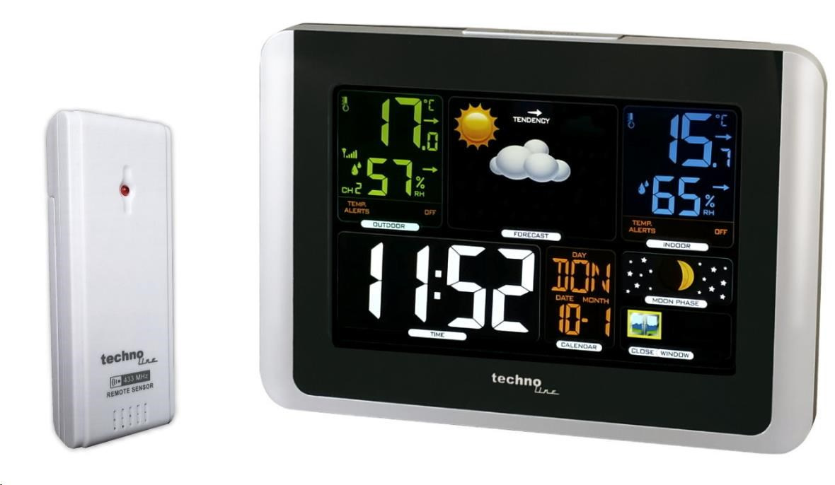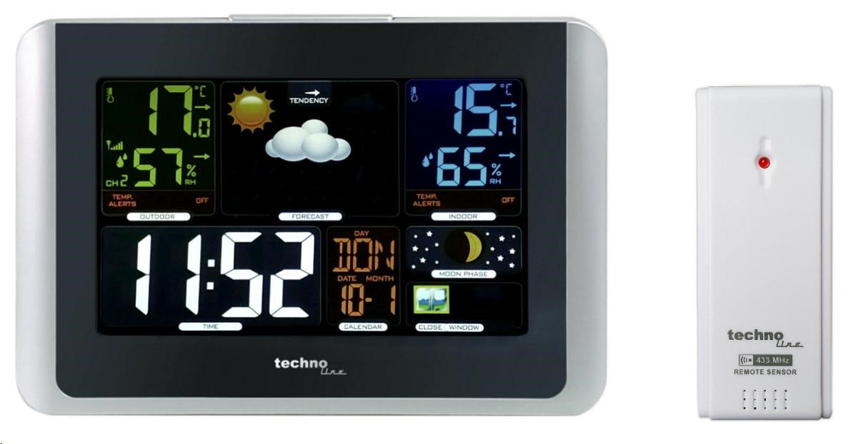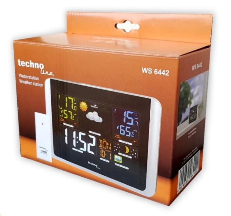 Meteorologická stanice s inverzním barevným LED displejem - barevný inverzní LED displej 127 x 79 mm, stále osvětlený při napájení síťovým adaptérem, 2 stupně jasu, možnost vypnutí, při napájení bateriemi možnost osvětlení displeje na 10 s - barvy displeje: čas bílá, datum oranžová, vnitřní teplota a relativní vlhkost modrá, venkovní teplota a relativní vlhkost zelená - velikost číslic: čas 25,5 mm, zkr. názvu dne, datum 10 mm, teplota 15,5 mm, rel. vlhkost 11,5 mm - čas řízený rádiovým signálem DCF-77 - možnost manuálního nastavení času - 12ti, nebo 24 hodinový formát zobrazení času - možnost nastavení časové zóny od -12 do +12 hodin - datum, zkratka názvu dne (EN, FR, GE, SP, IT, NL, DK) - budík s funkcí opakovaného buzení (Snooze) po 10 minutách - buzení zvukovým signálem (10 sekund 1 pípnutí za sekundu, 10 sekund 2 pípnutí za sekundu, poté stále 4 pípnutí za sekundu) - 6 animovaných ikon předpovědi počasí (jasno, polojasno, zataženo, déšť, bouřky, sněhové přeháňky) - zobrazení hodnot vnitřní a vnější teploty a relativní vlhkosti - možnost zobrazení teploty ve F, nebo ve C - paměť na max a min naměřené hodnoty teploty a relativní vlhkosti (automaticky se mažou v 0:00 hodin) - šipky tendence vývoje barometrického tlaku, vnitřní teploty a relativní vlhkosti - alarm horní a dolní meze vnější teploty na každém kanálu v rozsahu od -40 C do +60 C zvukovým signálem - alarm horní a dolní meze vnitřní teploty v rozsahu od 0 C do +50 C zvukovým signálem - ikona nutnosti zavření, nebo otevření okna na základě naměření vnitřní teploty a relativní vlhkosti - možnost zobrazení venkovního rosného bodu a teplotního indexu - fáze Měsíce - možnost připojení až 3 bezdrátových čide- mode- mode- TX960-TH, jedno bezdrátové čidlo je součástí balení - možnost automatického přepínání kanálů po 30 s - bezdrátový přenos hodnot vnější teploty na frekvenci 433 MHz - dosah až 100 m v otevřeném prostoru - indikace slabých baterií - barva hlavní jednotky černá se stříbrným rámečkem - rozměry hlavní části 174 x 119 x 29 mm - napájení síťovým adaptérem nebo bateriemi - možnost postavení, nebo zavěšení Bezdrátové čidlo TX960-TH - voděodolné provedení - dosah signálu bezdrátového čidla až 100 m v otevřeném prostoru - měření teploty a relativní vlhkosti - indikace vysílání LED diodou - možnost postavení a zavěšení - barva bílá - rozměry 39 x 99 x 24 mm - napájení 3 ks baterií 1,5 V typ AAA (mikrotužkové) Obsah balení - hlavní jednotka WS 6442 - bezdrátové čidlo TX960-TH - síťový adaptér 5 V, 150 mA - návod CZ, EN, PL, GE, FR, ES, IT, NL.