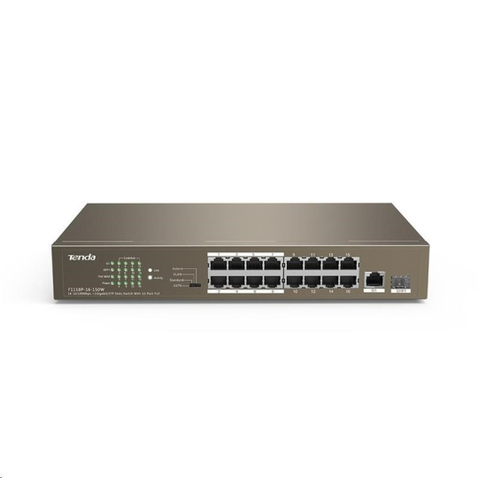 Tenda TEF1118P-16-150W přepíná data pomocí 17ti portů RJ45/SFP, 16 portů 10/100 Mb/s podporuje PoE802.3af/at + 1 Combo port pro Uplink (buď 1xRJ45 10/100/1000 Mb/s nebo 1xSFP 100/1000 Mb/s). Switch má ochranu proti přepětí 6kV. Podpora přepojování uzlů v módu Store-and-Forward a Cut-throught. Full-duplex kontrola toku 802.3x, half-duplex kontrola toku v režimu Back-Pressure.