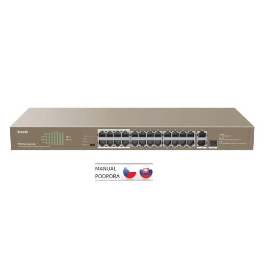 Tenda TEF1126P-24-410W přepíná data pomocí 26ti portů RJ45/SFP, 24 portů 10/100 Mb/s podporuje PoE802.3af/at + 1x RJ45 10/100/1000 Mb/s + 1xCombo RJ45/SFP 100/1000 Mb/s pro Uplink. Switch má ochranu proti přepětí 6kV. Podpora přepojování uzlů v módu Store-and-Forward. Full-duplex kontrola toku 802.3x, half-duplex kontrola toku v režimu Back-Pressure. TEF1126P-24-410W je vhodná jak do menších a středních firem, tak i do větších domácností.
