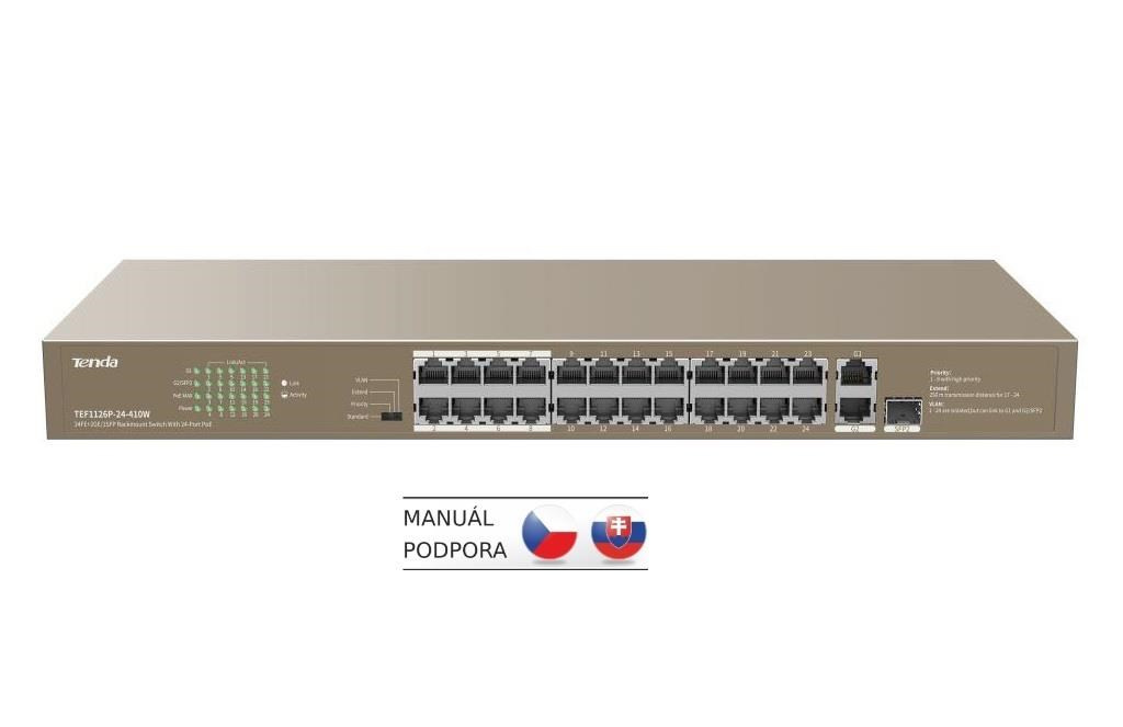 Tenda TEF1126P-24-410W přepíná data pomocí 26ti portů RJ45/SFP, 24 portů 10/100 Mb/s podporuje PoE802.3af/at + 1x RJ45 10/100/1000 Mb/s + 1xCombo RJ45/SFP 100/1000 Mb/s pro Uplink. Switch má ochranu proti přepětí 6kV. Podpora přepojování uzlů v módu Store-and-Forward. Full-duplex kontrola toku 802.3x, half-duplex kontrola toku v režimu Back-Pressure. TEF1126P-24-410W je vhodná jak do menších a středních firem, tak i do větších domácností.
