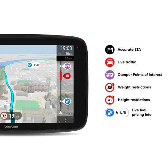 Na 7" dotykové obrazovce si můžete prohlédnout svou trasu ve vysokých detailech. A díky ovládání pomocí hlasových příkazů můžete zařízení GO Camper Max ovládat, aniž byste museli sundat ruce z volantu. Snadno použitelný držák Click-and-Drive navíc drží navigační zařízení bezpečně na místě.