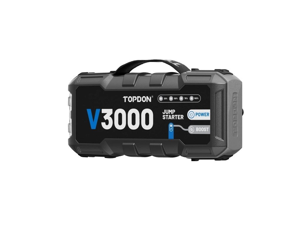 Startovací zdroj TOPDON V3000 je výkonově silný startovací booster a powerbanka v jednom je navržen pro náročné podmínky a vozidla s 12 V systémem (osobní auta, SUV, pick-upy, menší nákladní vozidla). Disponuje špičkovým proudem až 3000 A, díky čemuž spolehlivě nastartuje benzínové motory až 9,0 l a naftové až 7,0 l.