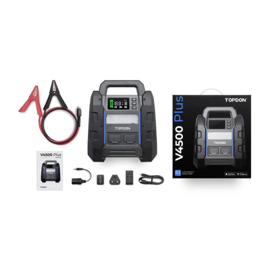 12 V startér TOPDON V4500 Plus je určen speciálně pro profesionální vozidla a vozidla s vysokým výkonem. Pyšní se špičkovým proudem až 4500 A a během několika sekund rychle oživí nejrůznější vozidla - od návěsů a přívěsů až po terénní vozidla a lodě. Navíc s kapacitou až 45 startů na jedno nabití budete vždy připraveni vyrazit na cestu s jistotou.
