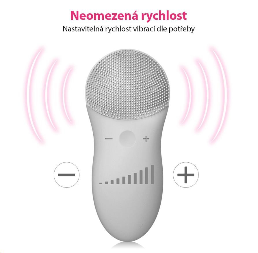 - Rychlost vibrací je nastavitelná pro přizpůsobení různým potřebám pokožky.