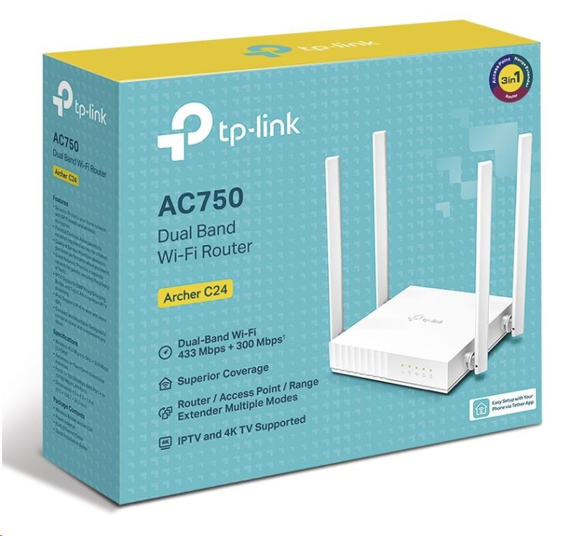 TP-Link Archer C24 WiFi5 router (AC750, 2,4GHz/5GHz, 4x100Mb/s LAN, 1x100Mb/s WAN)