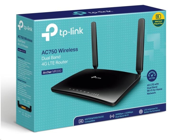 | Package Contents | AC750 Wireless Dual Band 4G LTE Router Archer MR200 RJ45 Ethernet Cable Power Adapter Quick Installation Guide |