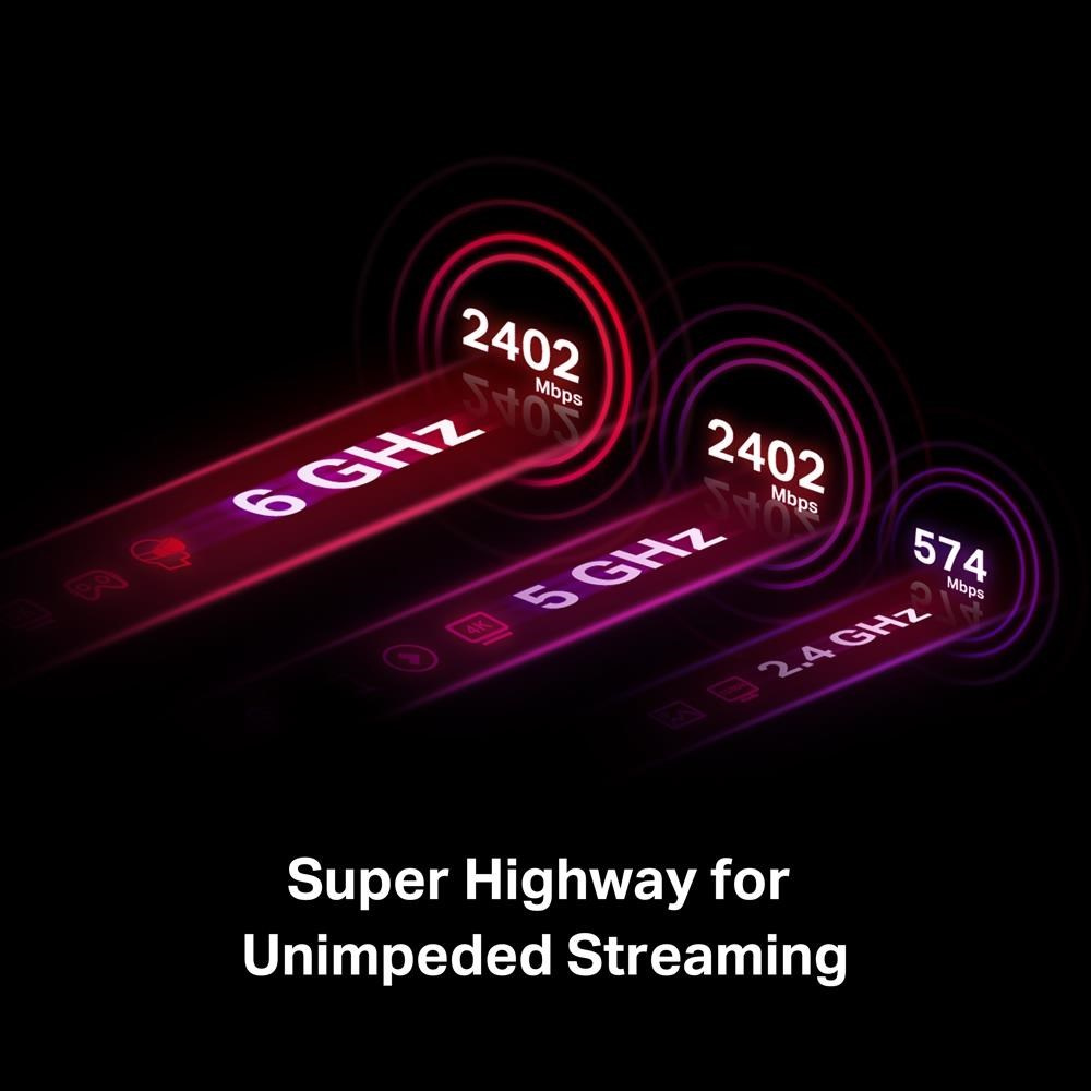 - Bezkonkurenční třípásmová rychlost — zvyšte celkové rychlosti až na 2 402 Mbit/s v pásmu 6 GHz + 2 402 Mbit/s v pásmu 5 GHz + 574 Mbit/s v pásmu 2,4 GHz.