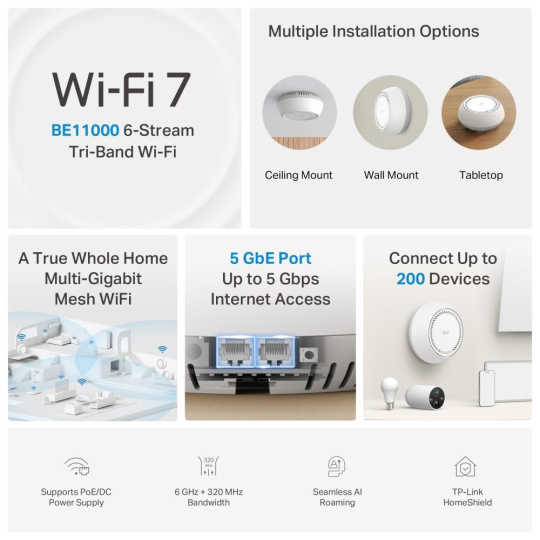 - Plynulá AI-Driven Mesh síť – Inteligentně se učí vaše síťové prostředí a poskytuje ideální Wi-Fi na míru vašemu domovu.‡