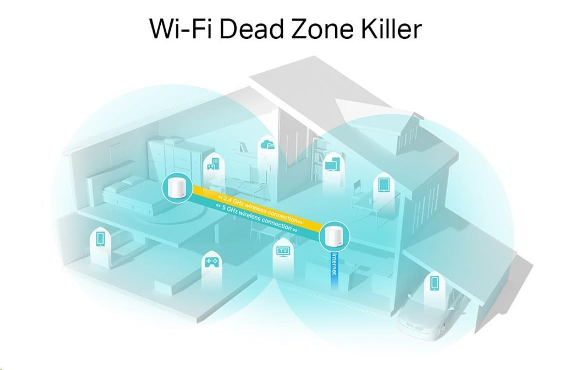 - Jedna sjednocená síť: Více jednotek tvoří domácí síť, která automaticky vybere nejlepší spojení, když se pohybujete po domácnosti.