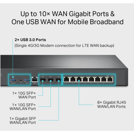 - Dva 10GE SFP+ porty - 1× WAN a 1× WAN/LAN 10GE SFP+ porty poskytují vysokorychlostní agregační konektivitu.