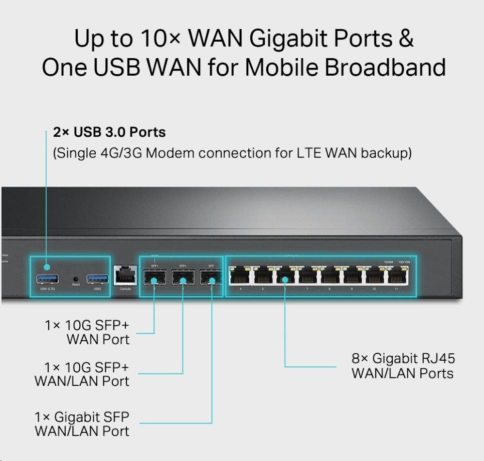 - Dva 10GE SFP+ porty - 1× WAN a 1× WAN/LAN 10GE SFP+ porty poskytují vysokorychlostní agregační konektivitu.