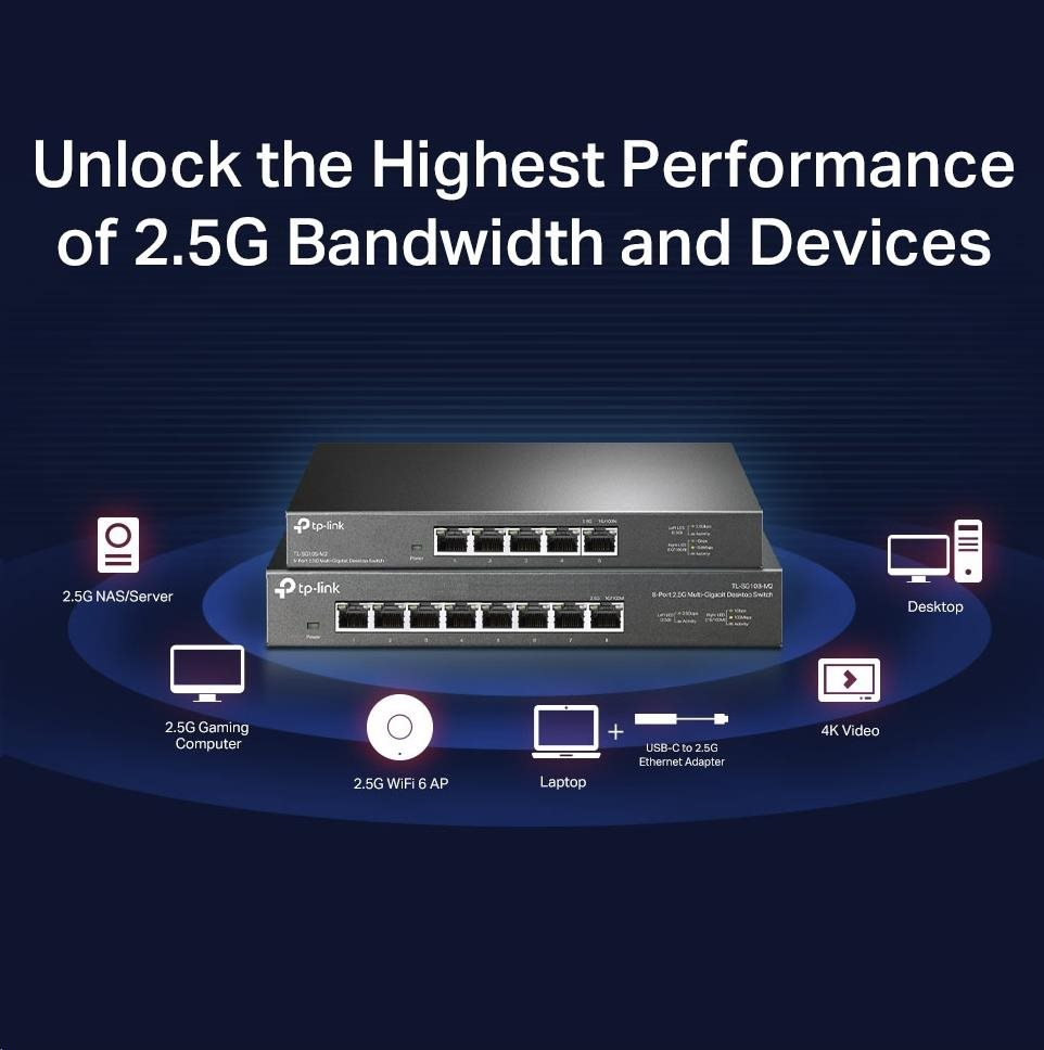 - Osm portů 2,5 Gbit/s. - Osm 2,5gigabitových portů umožňuje využít nejvyšší výkon multigigabitové šířky pásma a vašich zařízení, a poskytuje kapacitu přepínání až 40 Gbit/s.