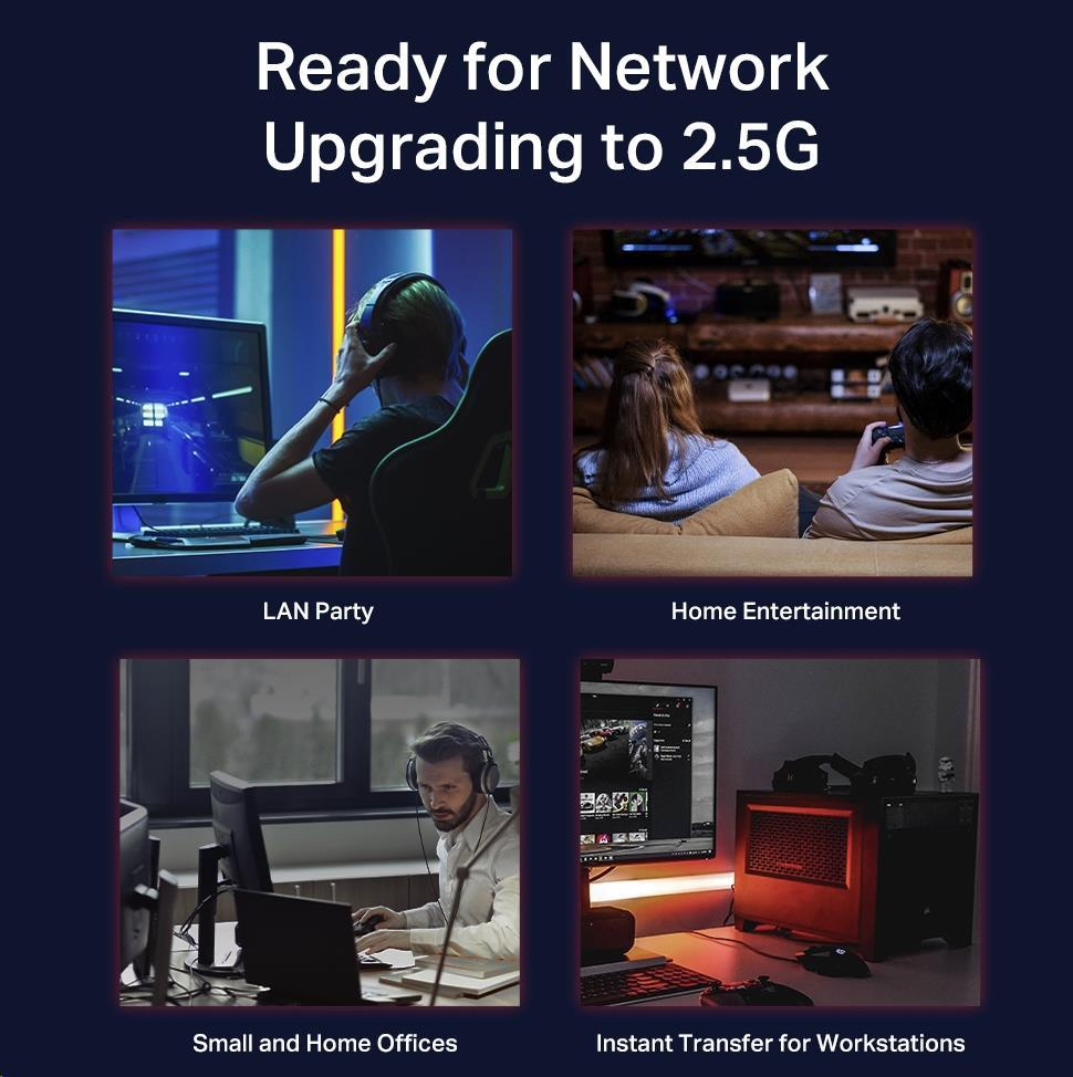 - Superrychlé připojení - Zajišťuje superrychlé připojení k úložišti NAS 2.5G, serveru 2.5G, hernímu počítači, přístupovému bodu 2.5G WiFi 6, 4K videu a dalším aplikacím.