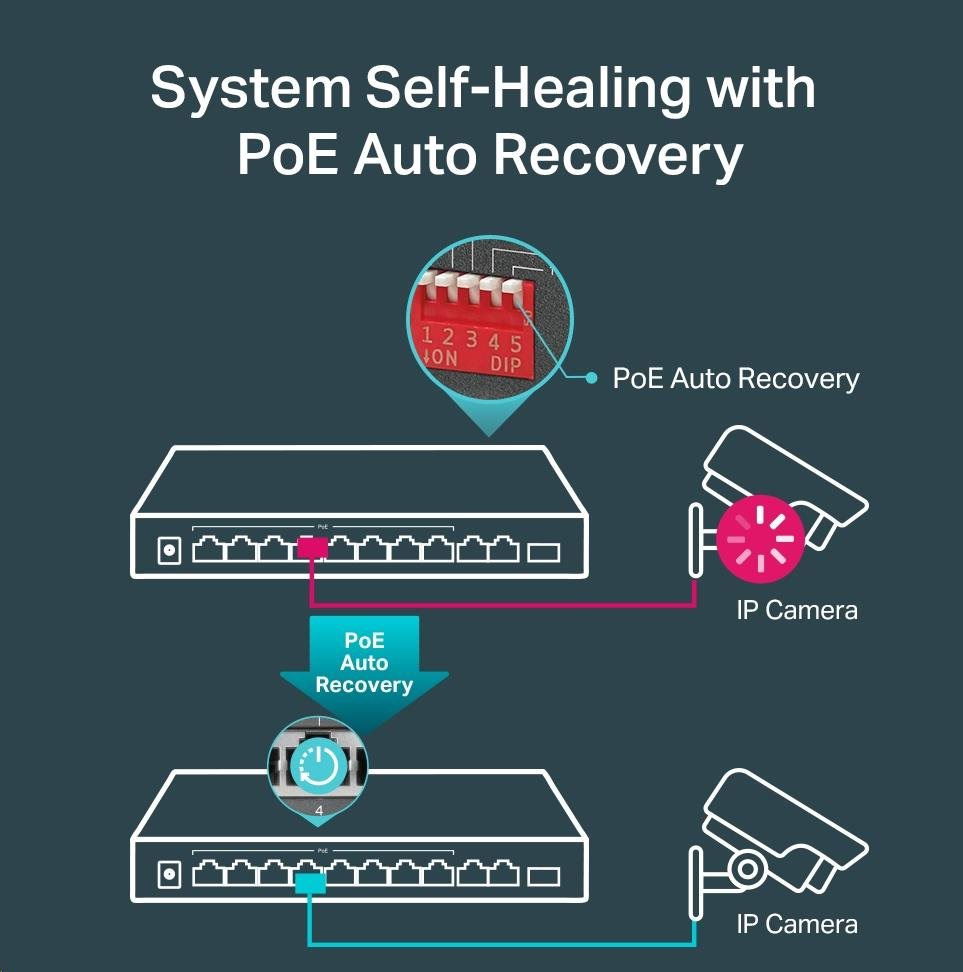 - S funkcí automatického obnovení PoE automaticky restartuje vypadlá nebo nereagující zařízení napájená přes PoE.